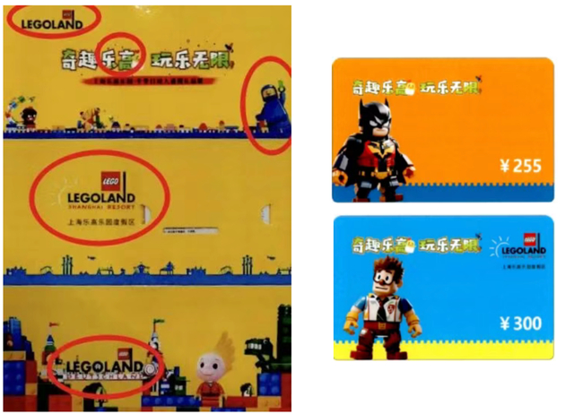 申请人乐高控股有限公司发现,有一家公司大量印制并销售“上海乐高乐园通用礼品票(卡)”,消费者可以使用这些礼品卡在该公司自己运营的微信小程序上兑换上海乐高乐园入园门票。这些礼品卡的外包装、圆形封口贴、礼品卡卡面以及微信小程序的头像、小程序页面等处,大量使用了与乐高公司权利商标相同或高度近似的标识。