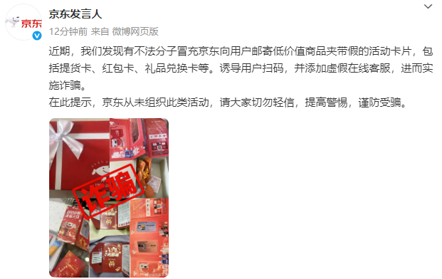12月22日,据@京东发言人 :近期,我们发现有不法分子冒充京东向用户邮寄低价值商品夹带假的活动卡片,包括提货卡、红包卡、礼品兑换卡等。诱导用户扫码,并添加虚假在线客服,进而实施诈骗。