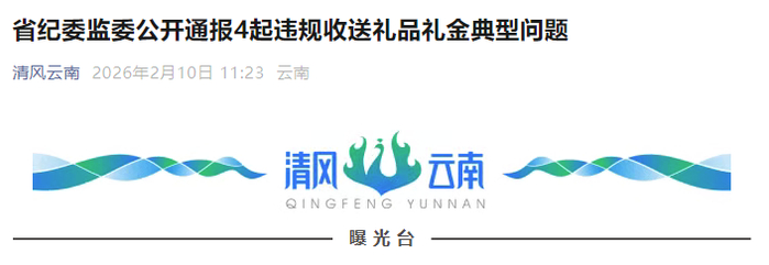 2026年春节将至,为强化正风肃纪,巩固拓展深入贯彻中央八项规定精神学习教育成果,持续深化清廉云南建设以“小”见严纠“四风”“固堤行动”工作成效,营造风清气正的节日氛围,现将4起违规收送礼品礼金典型问题进行公开通报。具体如下: